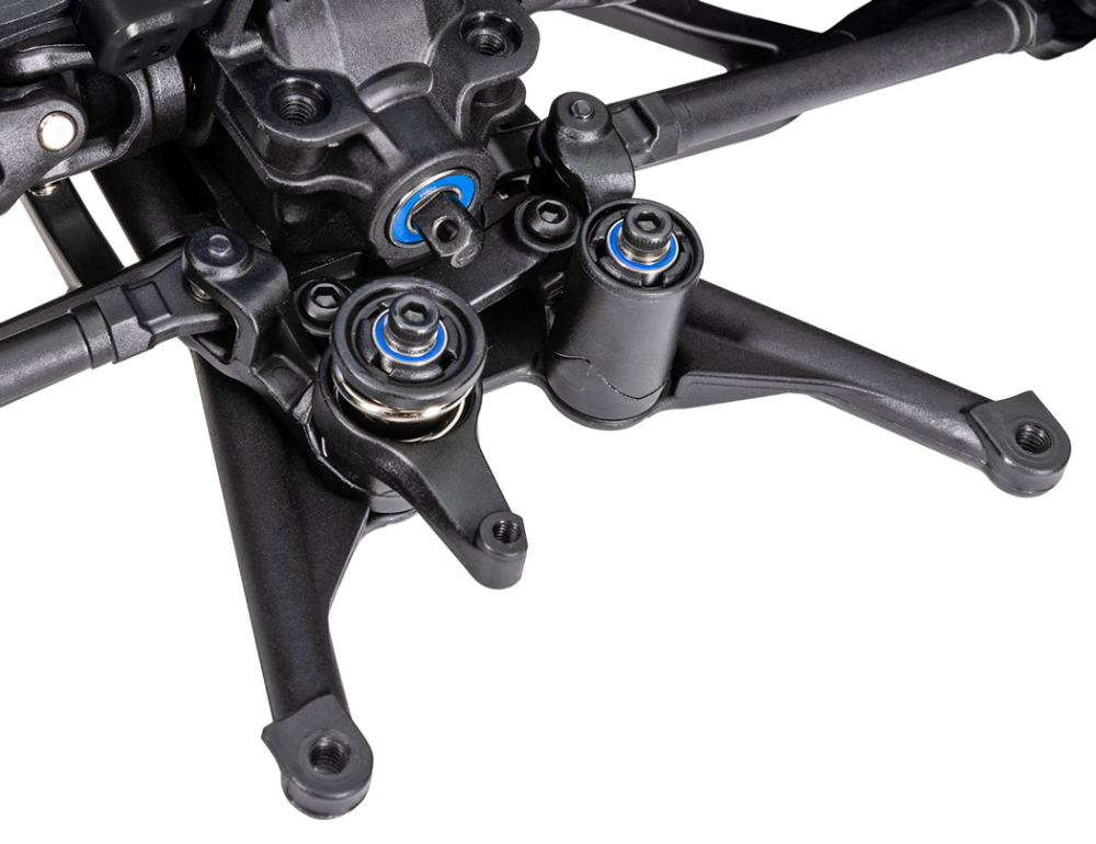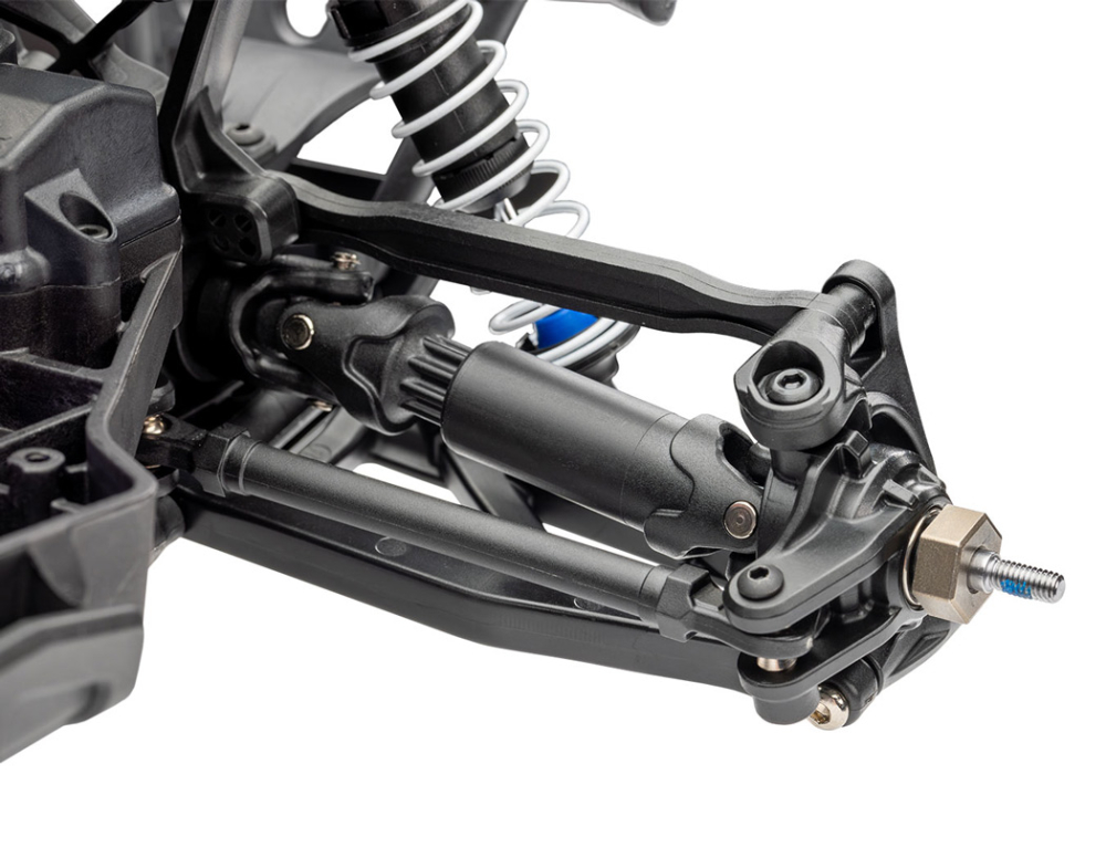 BIGFOOT 4X4 uses a shaft-driven four-wheel-drive system for extreme traction in any environment. A tough center driveshaft joins the front and rear steel-gear differentials to distribute the brushless motor’s massive torque. Huge Maxx-Duty® driveshafts keep power flowing to BIGFOOT’s towering monster truck wheels with unrivaled durability.